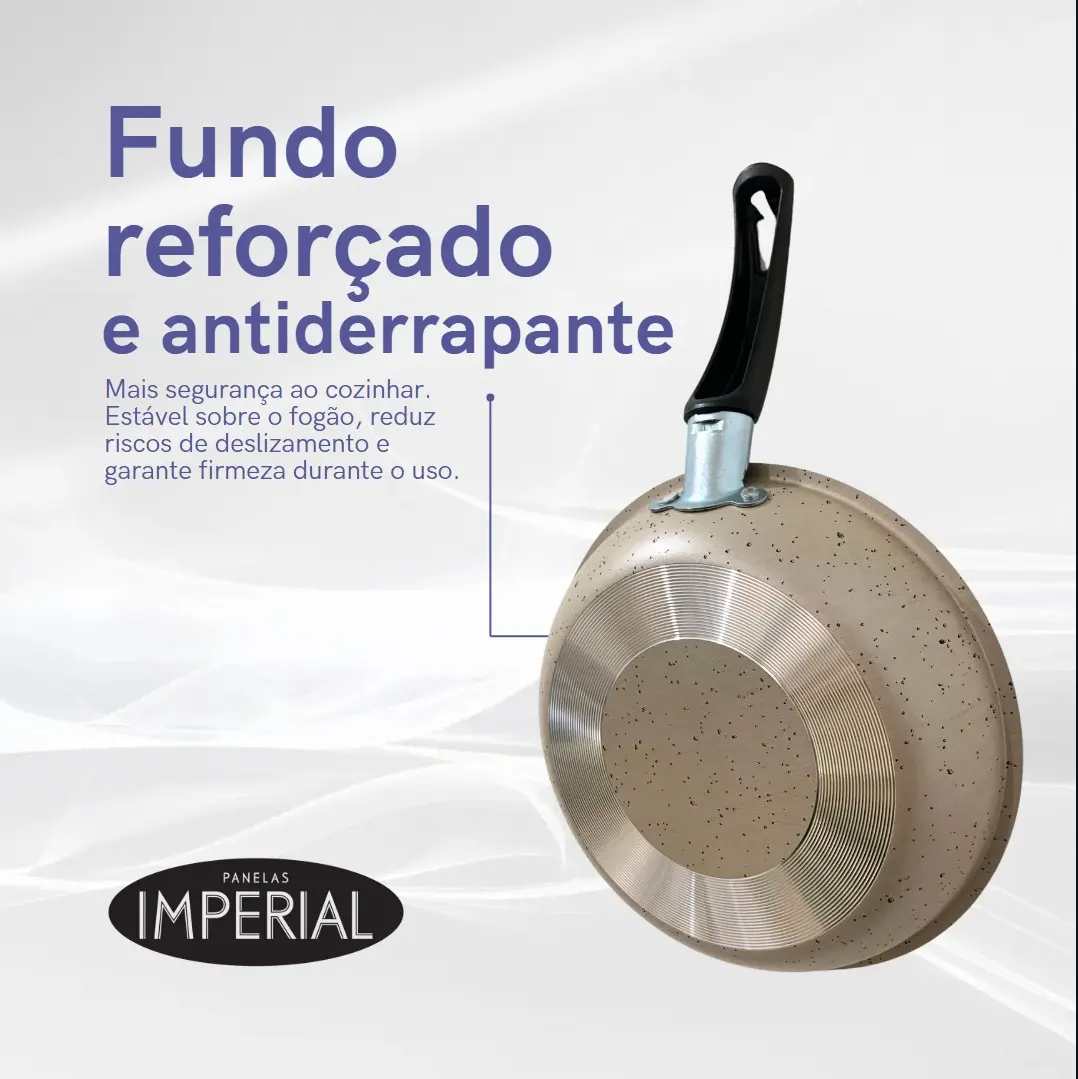 Conjunto completo de panelas Imperial® em alumínio com revestimento antiaderente em teflon, tampas de vidro. O Conjunto Imperial Cappuccino foi desenvolvido para oferecer eficiência e sofisticação no cotidiano culinário.